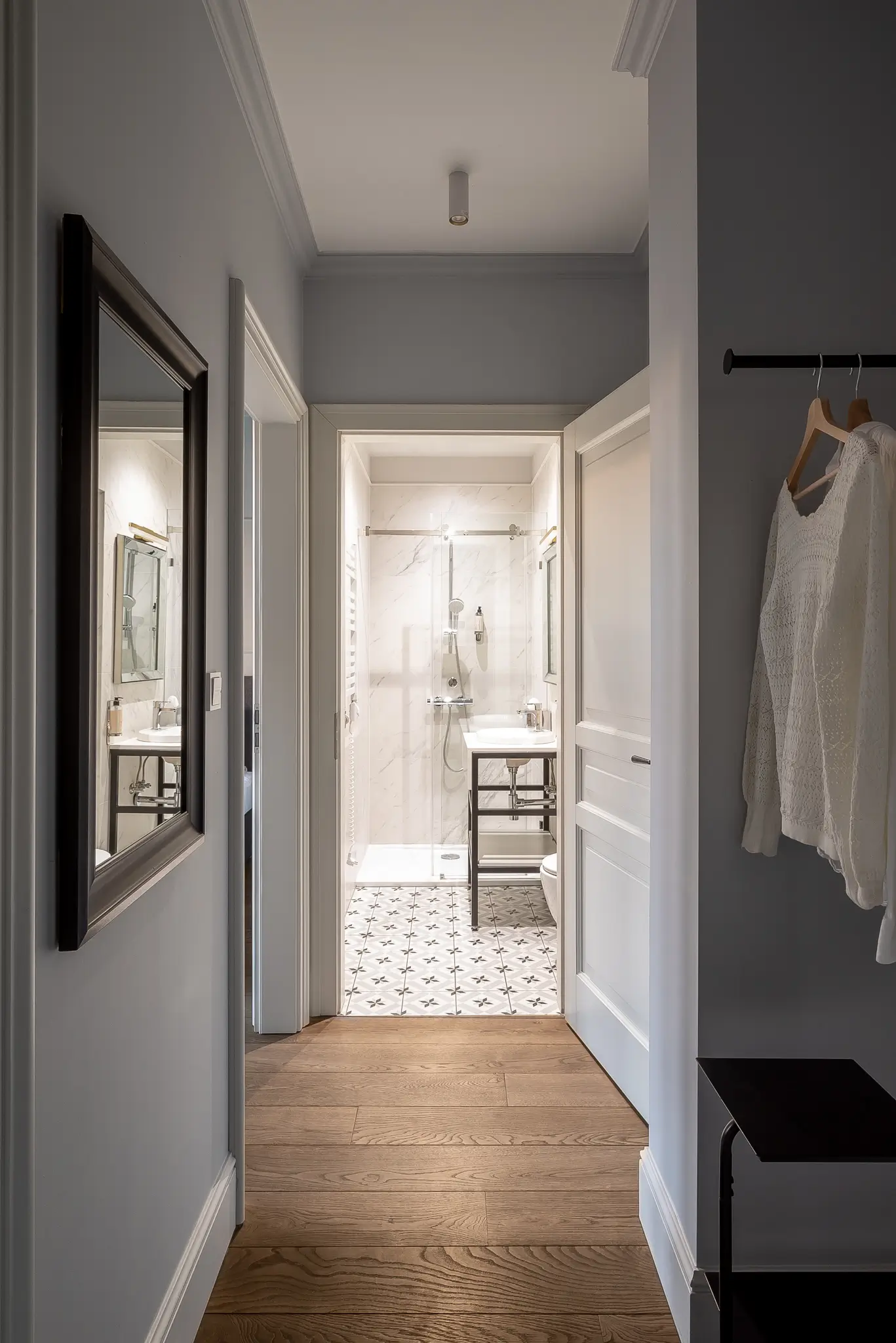 Łazienka wyposażona jest w prysznic, zestaw kosmetyków, komplety świeżych ręczników oraz suszarkę do włosów. Nowoczesna klimatyzacja zapewnia komfort termiczny niezależnie od pory roku. Możliwość połączenia wspólnym korytarzem z Apartamentem 7 czyni go świetną opcją dla dwóch rodzin podróżujących razem lub większych grup.