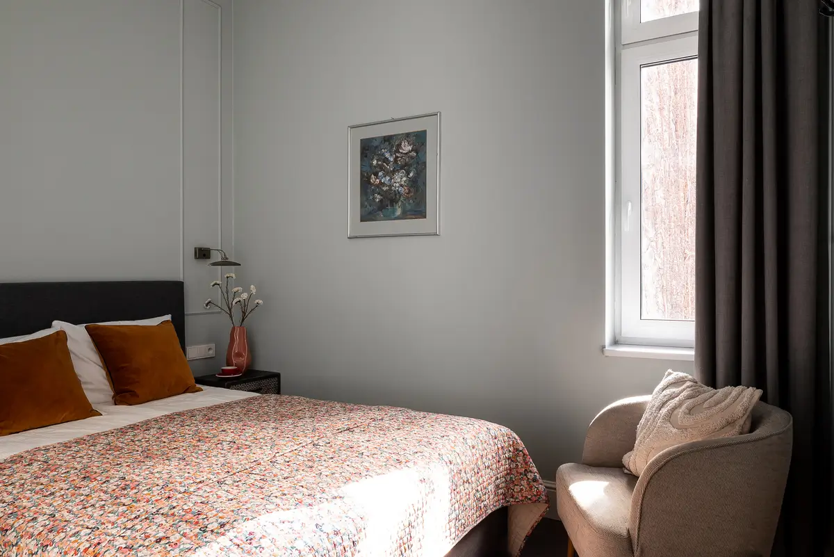 Apartament posiada duży, zielony balkon z widokiem na ciche podwórze, a także przestronną część dzienną z jadalnią, fotelem i dużą szafą. W pełni wyposażona kuchnia (kuchenka indukcyjna, lodówka, zestaw naczyń i sztućców, czajnik, ekspres) umożliwia samodzielne gotowanie.